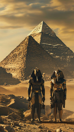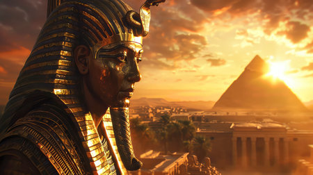 This striking portrayal captures the grandeur of an ancient Egyptian Pharaoh statue set against a mystical sunset, evoking a sense of history and culture.