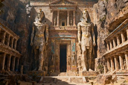 Majestic pharaoh stands proudly in a decorated temple, flanked by members of his court, showcasing the splendor and power of ancient Egypt