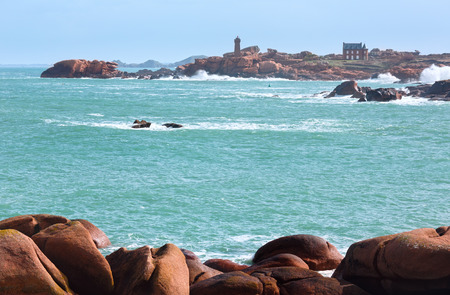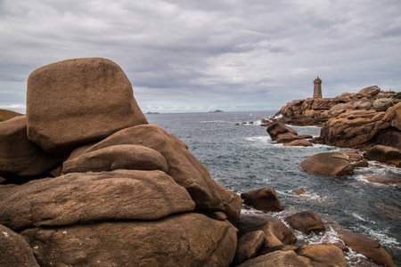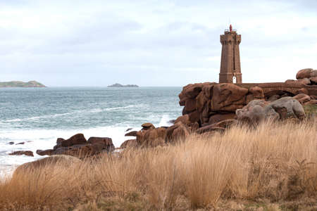 Perros Guirec, Ploumanac'h Lighthouse, Mean Ruz Lighthouse, la Manche,at winter, rocks and waves