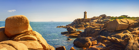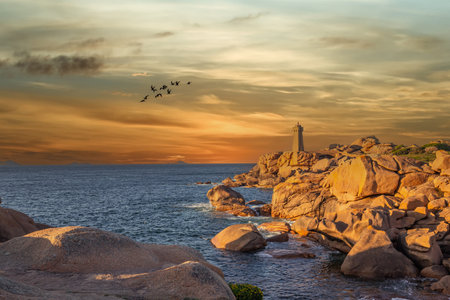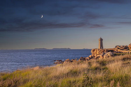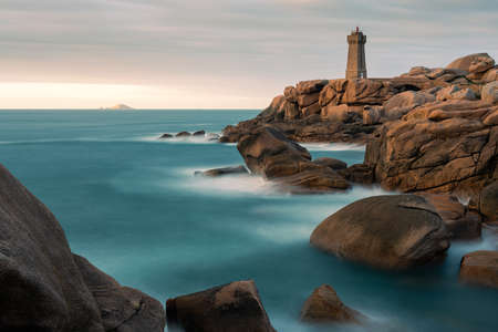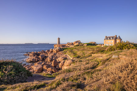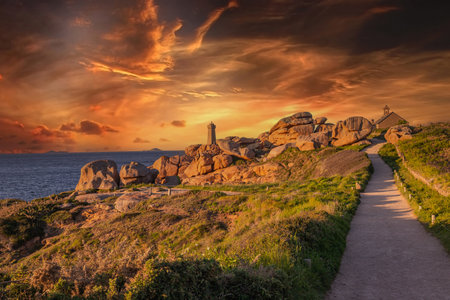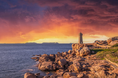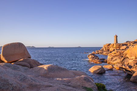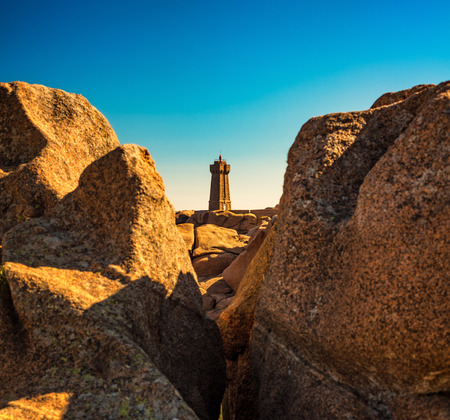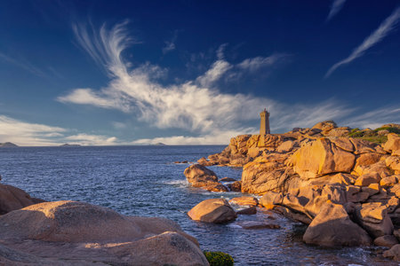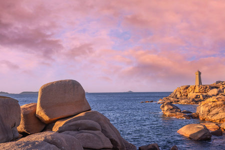 Magical place with high granite rocks and cute lighthouse. Atlantic Ocean coastline with stunning locations at sunset, Perros Guirec, Ploumanach, Brittany, France, Europe