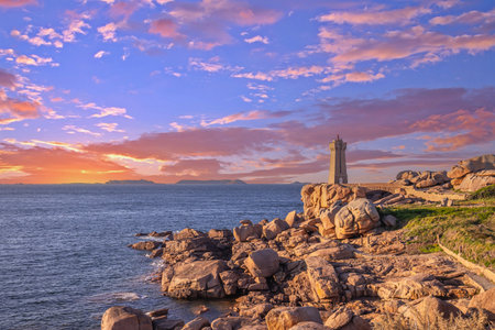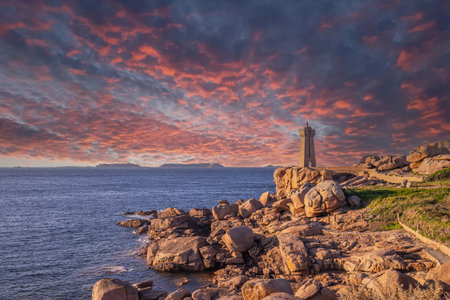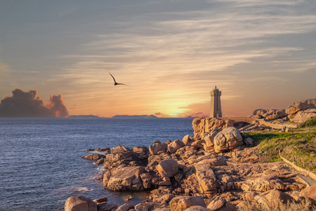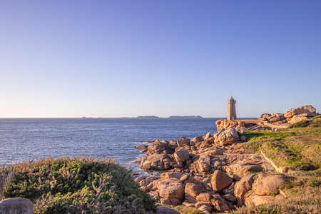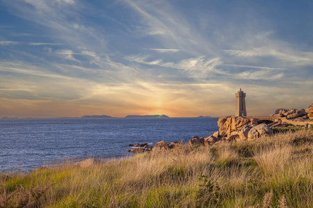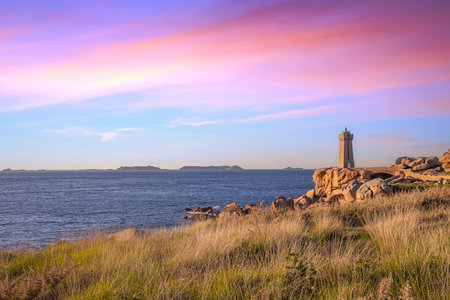 Lighthouse of Ploumanach Mean Ruz in Perros-Guirec on Pink Granite Coast, Brittany, France, on sunset