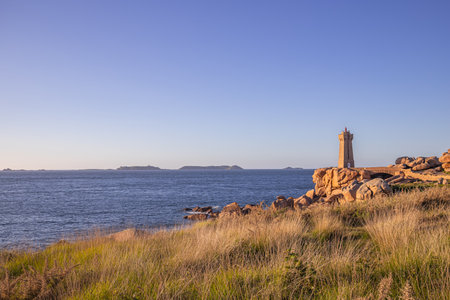 Ploumanach Mean Ruz lighthouse in the morning. Pink granite coast, Perros Guirec, Brittany region, France