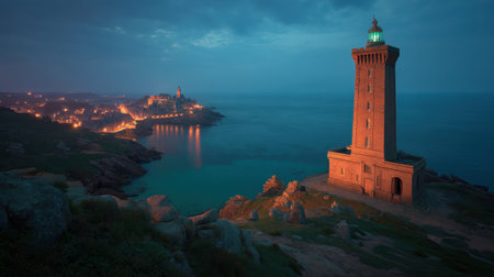 A captivating view of a lighthouse standing majestically by the coast during twilight, surrounded by a gently illuminated town and tranquil waters.