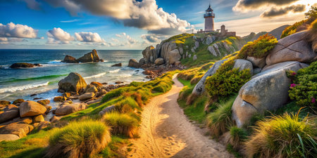 Brittany Coastline: Sandy Beach Path to Dramatic Rock Formations near Pontusval Lighthouse