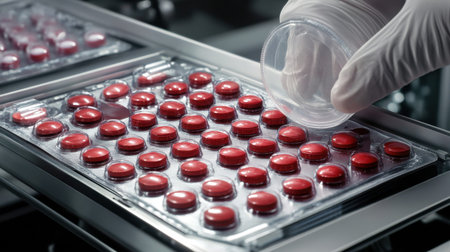 An image showcasing a hand in a glove placing a glass container over a tray of red pills in a modern laboratory, emphasizing the meticulous nature of pharmaceutical research.