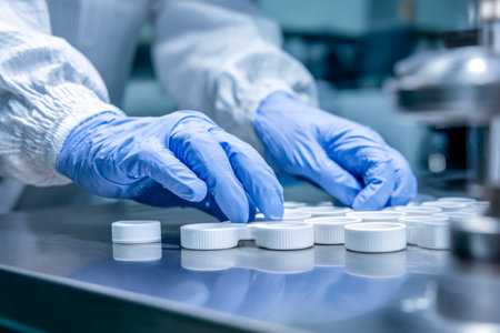 A skilled specialist inspects small medication tablets in a sterile lab environment, ensuring precise quality control and safety standards.