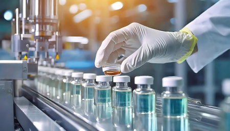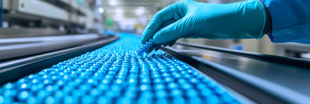 A gloved hand meticulously inspects medical vials on a high-tech production line in a pharmaceutical factory, highlighting stringent quality control measures and precision in medication