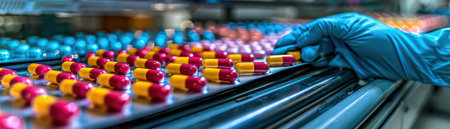 Detailed view of vibrant medication capsules on a production line, showcasing advanced machinery in a modern pharmaceutical facility focused on quality and efficiency.