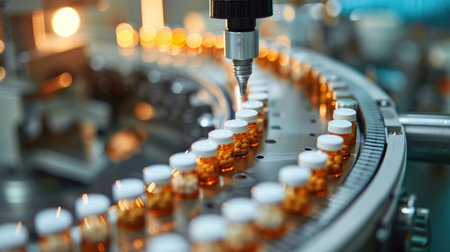 High-tech factory producing medicine tablets and vials with precision machinery