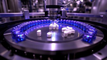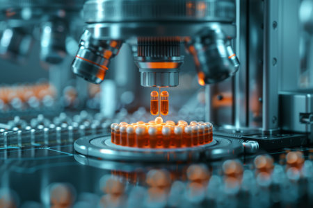 Precision machinery filling capsules with medication in a high-tech pharmaceutical manufacturing facility, showcasing the blend of healthcare and automation technology.