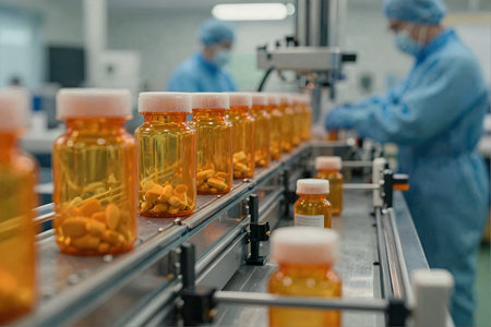 This image captures a modern pharmaceutical production line with bottles moving along a conveyor belt. Technicians in clean room attire oversee the process, emphasizing safety and quality control in the manufacturing environment.