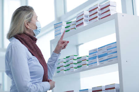 Woman Visitor Pharmacy Chooses Medicine in protective medical mask