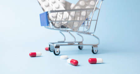 Purchase of pills and various medicines. An idea for healthcare and pharmaceutical company. Trolley with medicines on blue background close-up.