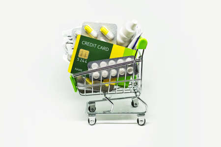 Pills in a shopping trolley on white background. Medical preparations on table. Insurance medicine concept.