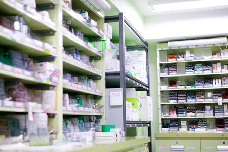 Blurred picture of medicine shelf in drug store. Pharmacy shop interiors. Pharmaceutical products in drugstore. Medical retail shop. Pharmacy in hospital. Healthcare business. Drug display shelf.