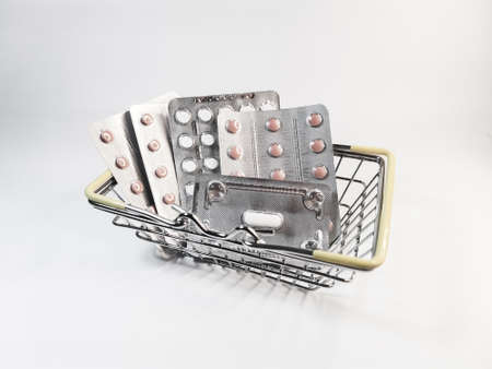 Several packs of pills of different types in a small supermarket metal basket on a white background. Healthcare and medical concept.