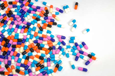 Assorted pharmaceutical medicine pills, tablets and capsules over white background.