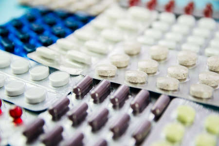 pile of medical pills in red, blue and yellow colors in silver plastic packaging