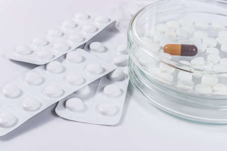 Assorted pharmaceutical medicine pills, tablets and capsules with blurred background over white background. Concept of healthcare and medicine. Copy space.