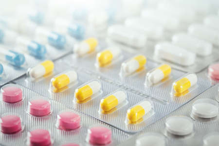 colorful pills and tablets on background.