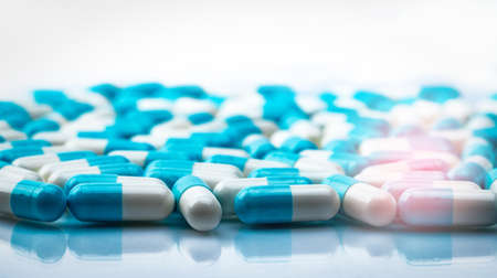 Selective focus on blue and white capsules pill spread on white background with shadow. Global healthcare concept. Antibiotics drug resistance. Antimicrobial capsule pills. Pharmaceutical industry.