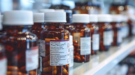 A close-up of labeled prescription medicine bottles lined up on a shelf inside a well-lit pharmacy.