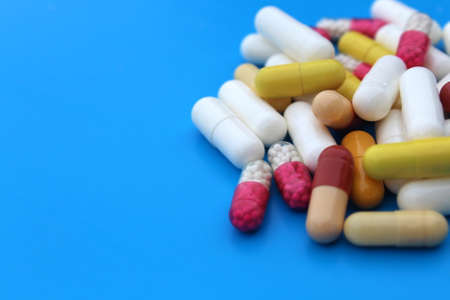 A lot of multicolored pills and capsules on a blue background as a concept of addiction from medicine. Vitamins to keep immunity on a high level.