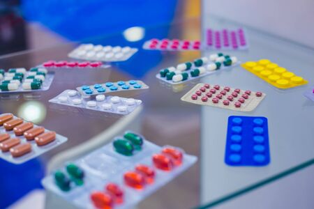 Colorful medical capsules, pills, tablets, drugs, meds in blister pack for sale at pharmacy drug store, pharmaceutical exhibition. Pharma industry, medicine and healthcare concept
