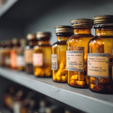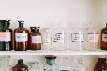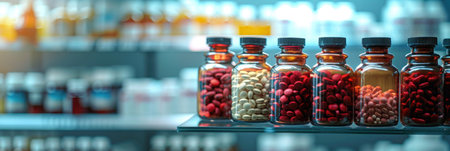 pills tablets medicine in glass bottles on a shelf in a pharmacy banner