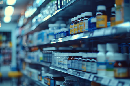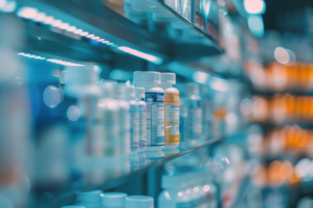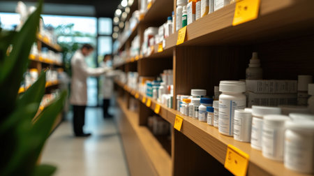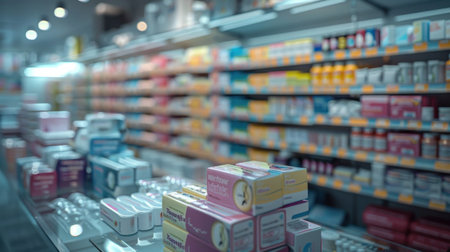 Blurred view of pharmacy with medicine racks, clean design, bright lights