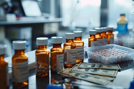 A table with many bottles of pills and a stack of cash. The pills are in different colors and sizes, and the cash is in various denominations
