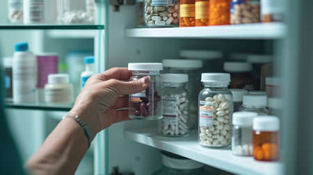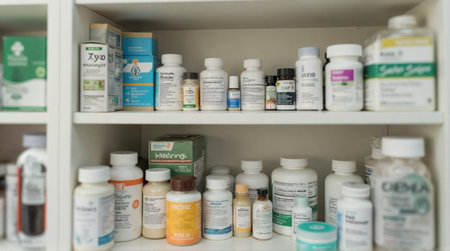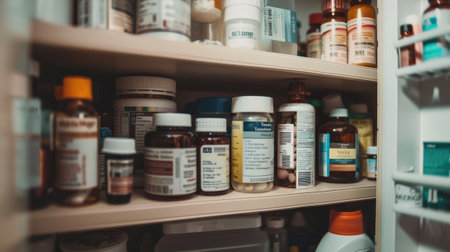 Stocked medicine cabinet filled with various supplements and vitamins for health and wellbeing lifestyle