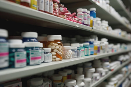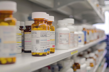 A well-lit pharmacy shelf with a variety of pill bottles, boxes, and syringes, arranged neatly with empty space around them for text, copy space.