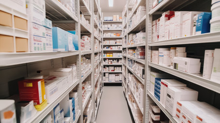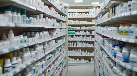 A row of shelves in a pharmacy store displaying a wide variety of pills used for medication and treatment, Pharmacy selling prescription opioids, AI Generated