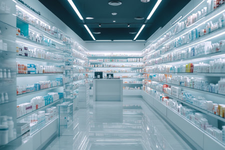 Interior view of a contemporary pharmacy shop with clean and empty aisles for a modern look
