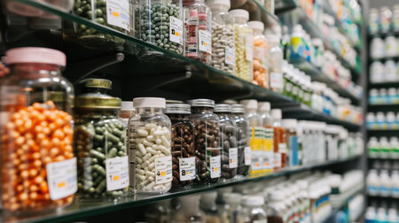 Shelves with bottles and jars of vitamins and supplements in a pharmacy.