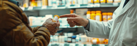 A pharmacy counter with pharmacists explaining medication usage to a patient and shelves stocked with medicines