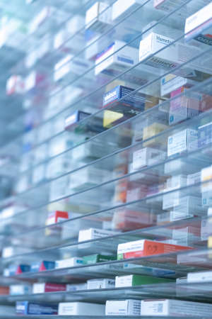 A pharmacy storage room ,Drugs are arranging and stored on a glass shelf in a pharmacy.taken out with a robot hand