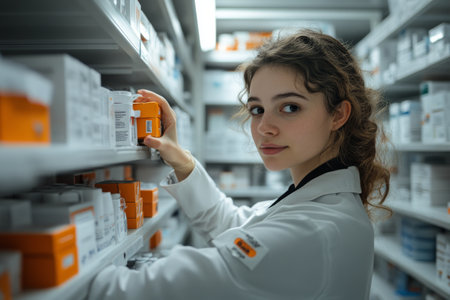 A young female pharmacist arranging medication boxes on pharmacy shelves, ensuring inventory organization in a well-lit medical environment.