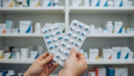 A close-up shot of hands holding medication blister packs in a pharmacy, with shelves of medicines in the background.