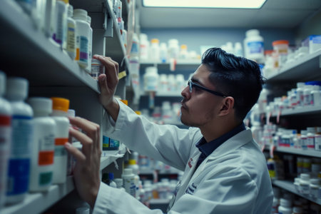 A healthcare professional focused on selecting the right drugs from a shelf, ensuring accuracy and quality in pharmacy care.