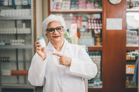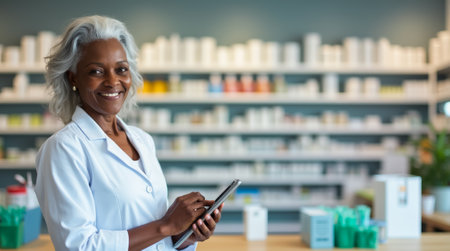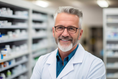 Mature pharmacist holding prescription medicine with confidence generated by artificial intelligence
