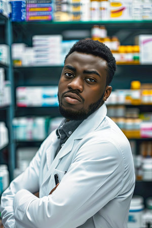 Confident African American man pharmacist standing in interior of pharmacy