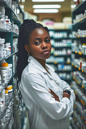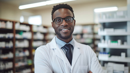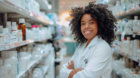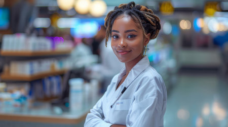 Portrait of a confident young African American woman working as a pharmacist in a well-equipped, modern pharmacy. She is smiling, projecting professionalism and approachability.