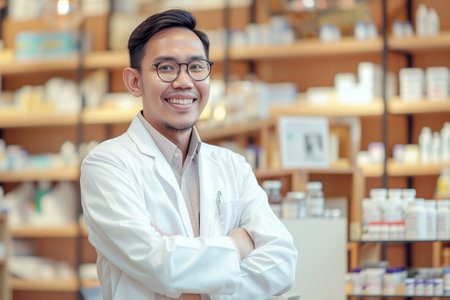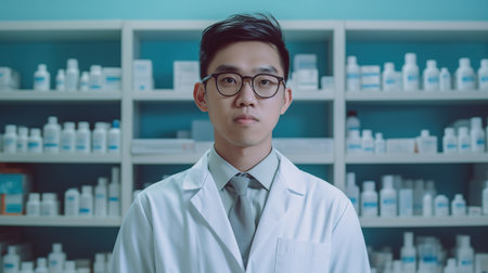 Portrait of young Asian male pharmacist standing in pharmacy drugstore