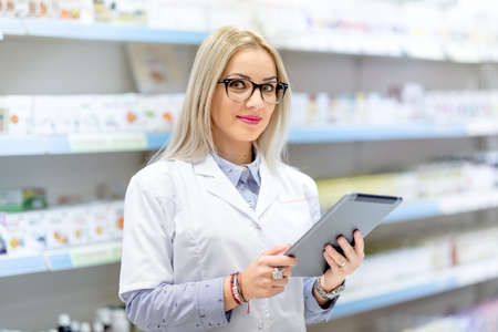 Cute blonde doctor in white uniform using tablet and technology in pharmaceutical or medical field