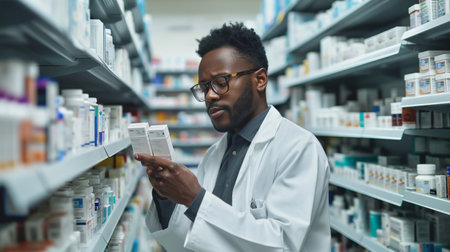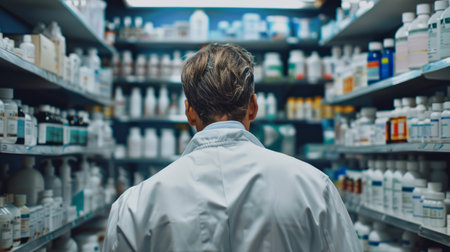 Concentrated pharmacist searching for medications on shelves in a modern pharmacy, ensuring patients receive the right treatment