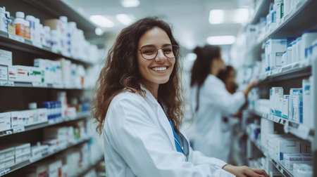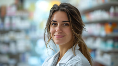 female pharmacist poses confidently welcoming, advising patients and prescription patients in a modern pharmacy.
