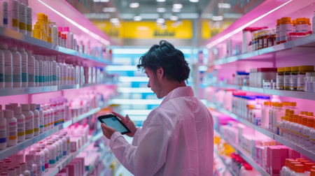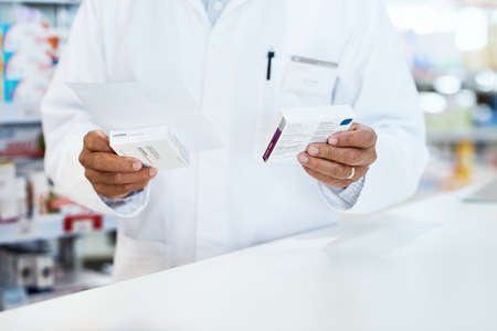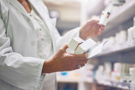 Pharmacist checking Checks Inventory of Medicine, Drugs, Vitamins and prescription medication checks in modern pharmacy.