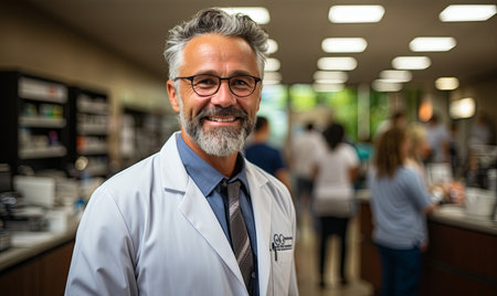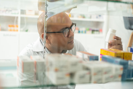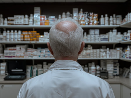 Pharmacist with thinning hair in a pharmacy setting.
